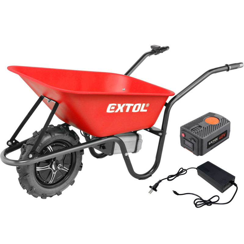 Aku elektrické kolečko, rychlejší a snazší přeprava materiálu, variabilní rychlost dopředu i dozadu (0-6 km/h), elektrická brzda, normální nebo turbo výkon, max. zatížení 150 kg, objem kovové korby 80 l, vyjímatelná Li-ion baterie (40V, 6000 mAh) s LED displejem, terénní nafukovací pneumatika průměru 40 cm, dojezd na jedno nabití 3-20 km (1-5h) dle pracovních podmínek, elektromotor 500 W, krytí IP64 umožňuje práci ve vlhku nebo mytí kolečka, nabíjení akumulátoru cca 2-3 h, dodáváno vč. akumulátoru a nabíječky.