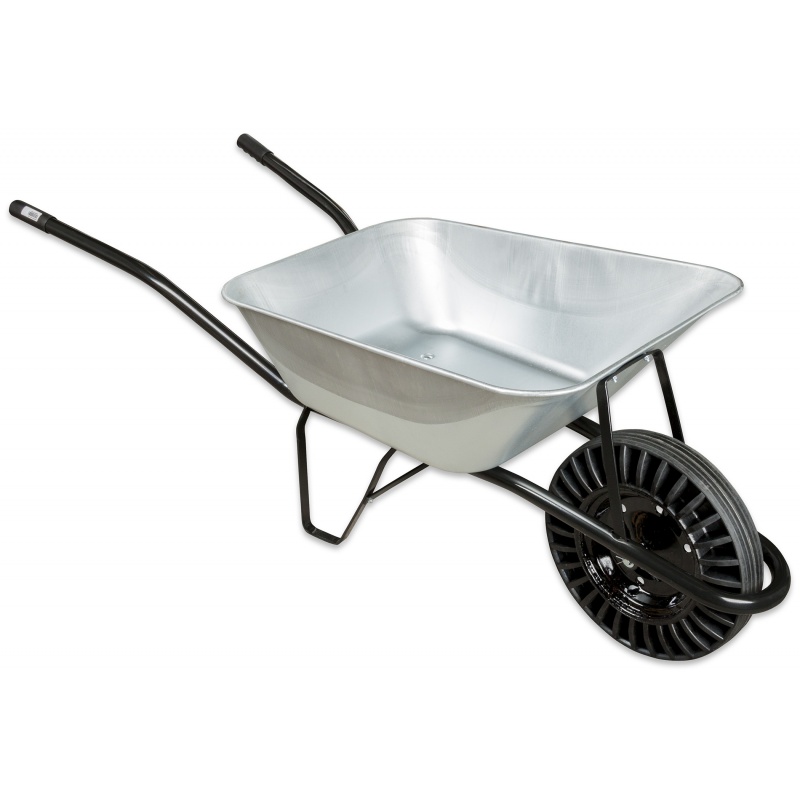 Stavební kolečko vyrobené v ČR, korba 80 l, z pozinkovaného plechu, bantamové plné kolo, které nepropíchnete, s kuličkovým ložiskem se snadněji tlačí, průměr 38 cm, plechový střed, volná pozinkovaná osa průměru 16 mm se samo jistící matkou.